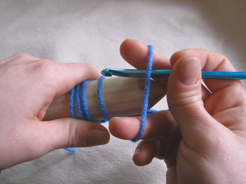 And now, the moment we’ve been waiting for, the first lace group! Grab up your hook again and insert it through the first five loops, pulling them a little taut. Now get your ball-end yarn in working order through the fingers of your left hand: